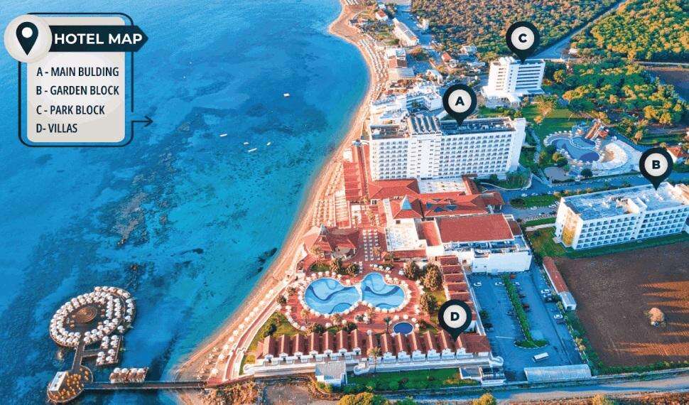 Ciprus északi, a törökök által lakott részén, Famagusta központjától kb. 8 km-re épült, hatalmas 65 hektáros területen (főépület, melléképület és villák) elhelyezkedő igen népszerű és nagy visszatérő vendégkörrel rendelkező ultra all inclusive szálloda, közvetlenül a lassan mélyülő finomhomokos tengerparton található.