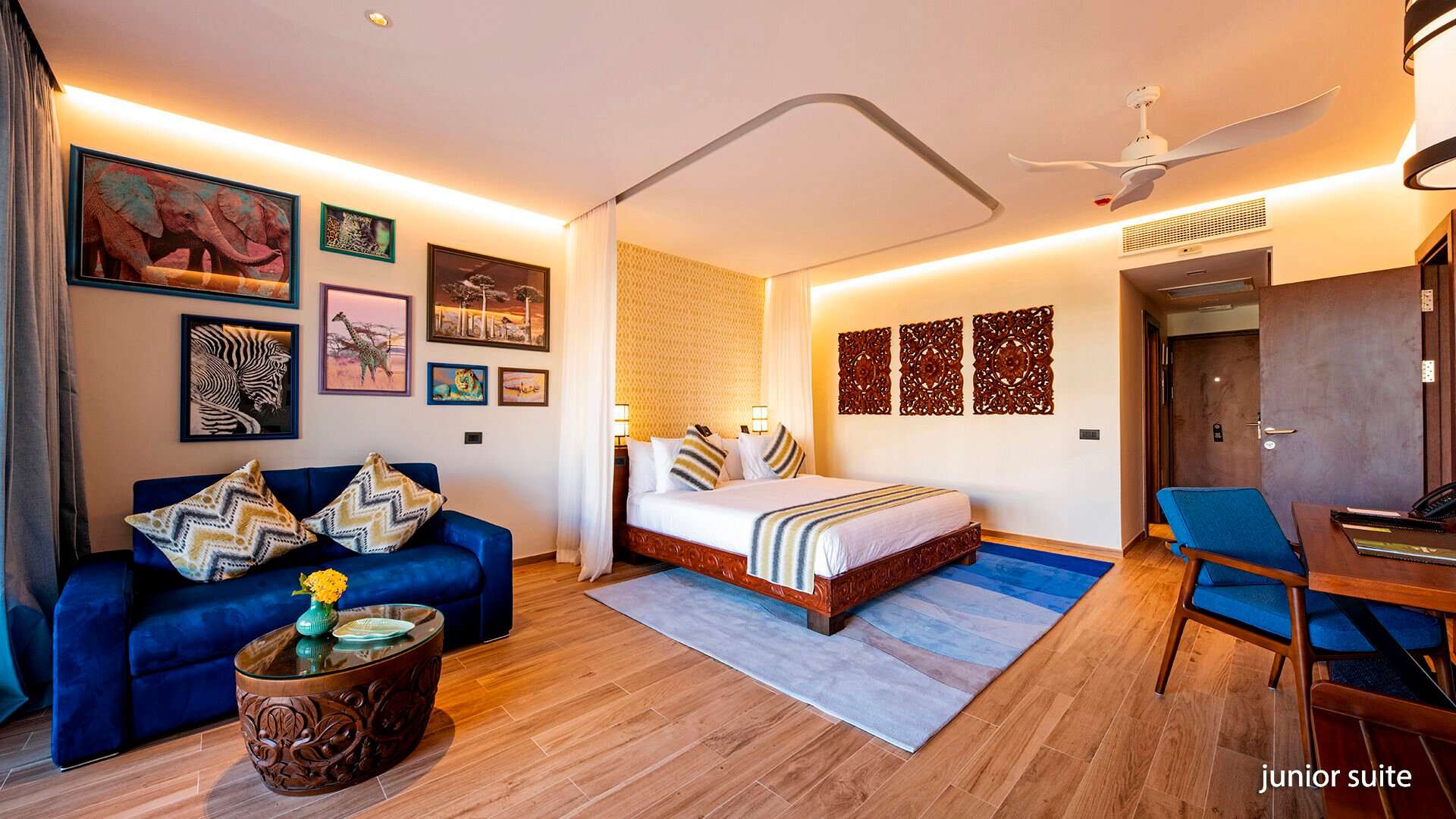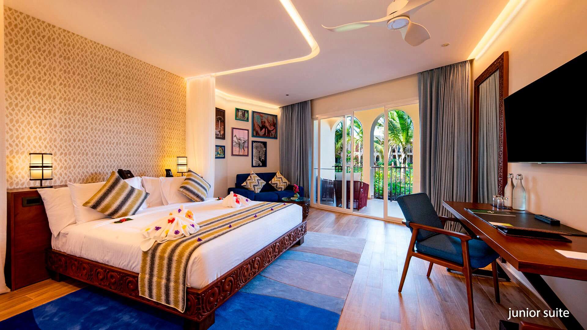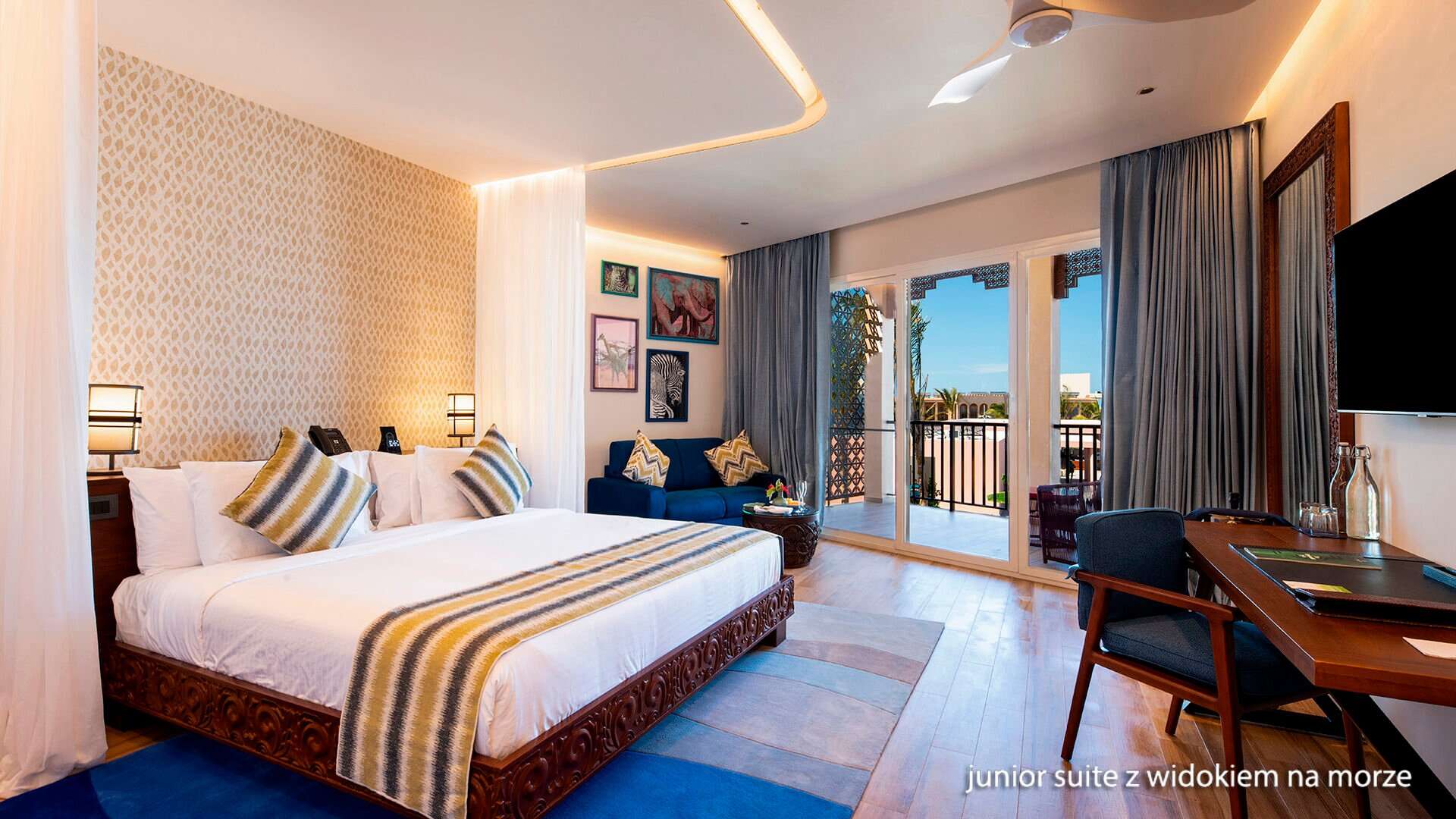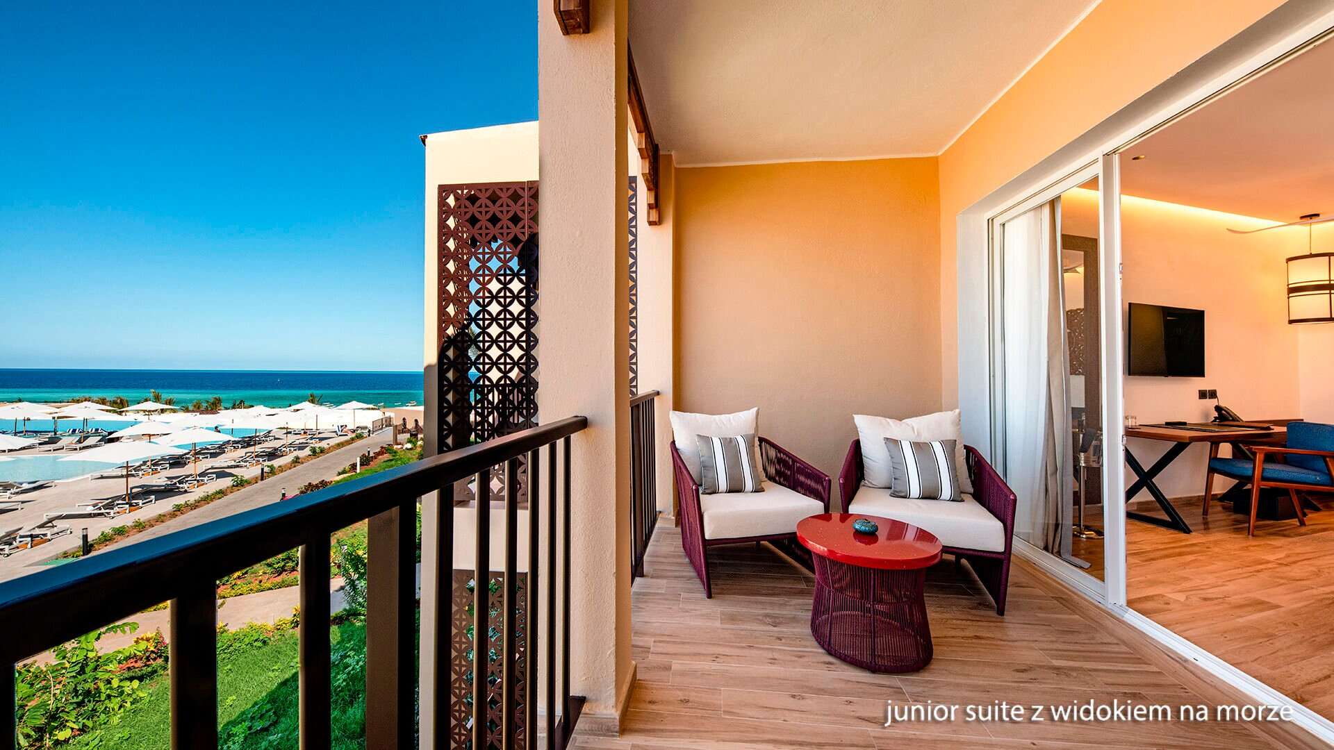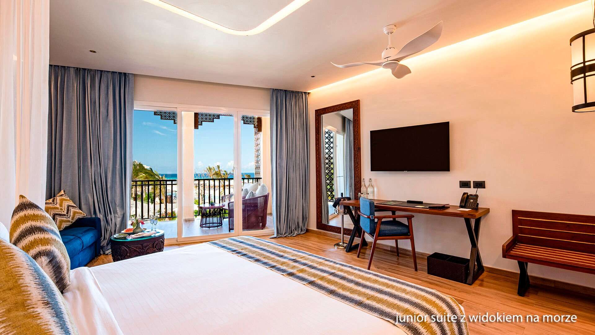 Tengerre néző junior suite: a letisztult stílusú, harmonikus színekkel és elegáns bútorokkal berendezett, erkélyes, az Indiai-óceánra néző kétágyas szobákban fürdőszoba, műholdas televízió, gardrob szekrény, egyénileg szabályozható légkondicionáló, írósztal és WIFI biztosítja a kényelmet.